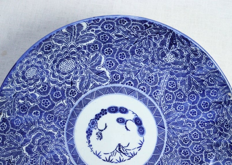 - 美術品・アンティーク・コレクション > 工芸品 > 幕末~明治期 古伊万里 染付 見込みに唐人図 微塵唐草文 山水人物図 24cm 幕末~明治期 古伊万里 染付 見込みに唐人図 微塵唐草文 山水